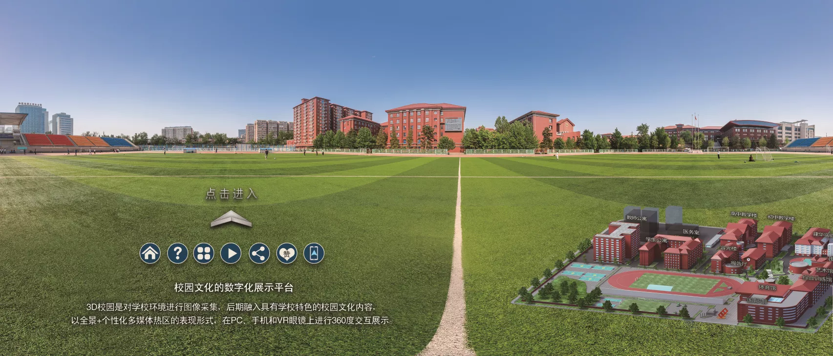 随着互联网+时代的到来,数字3D虚拟现实技术以其画面精美、内容丰富多彩、运行高效便捷、功能实用、信息分享直观方便等特点为校园文化展示和互动带来了全新的形式。通过VR校园文化展示可以拓展现实校园的时间和空间维度,有声有色地展现校园景观、教学设施、师资力量、教学成果、展示学校发展历程、举办立体书画展等,为学校树立良好的形象,提高学校的知名度,宣传校园文化。VR校园文化互动平台可包含VR校园、手机引导、虚拟校史馆、校园美术馆、数字阅览、互动知识等应用,使用户能够不受时间和空间的限制,直接通过触摸屏或在线浏览。